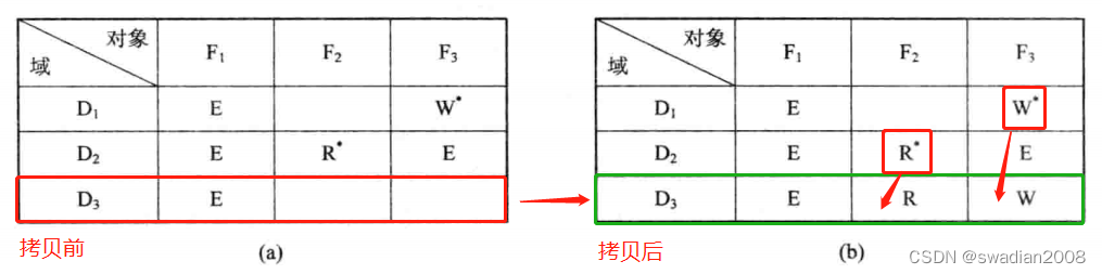 应注意的是,把带有*号的拷贝权拷贝到新的域以后,其所建立的访问权不再带有 * 号,这使在域 D3 上运行的进程不能再将其拷贝权进行扩散,这种拷贝方式被称为限制拷贝。