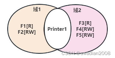下图中给出了两个保护域。在域 1 中有两个文件 F1 和 F2,只允许进程对 F1 读,而允许对 F2 读和写;而对象 Printer1 同时出现在域 1 和域 2 中,这表示在这两个域中运行的进程都能使用打印机。