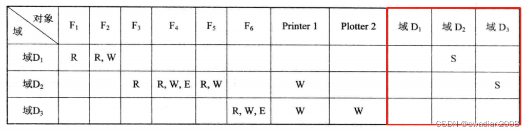 为了能对进程进行控制,同样应将切换作为一种权力,仅当进程有切换权时,才能进行这种切换。为此,在访问矩阵中又增加了几个对象(切换域)。