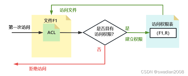 目前,大多数系统都同时采用访问控制表和访问权限表,在系统中为每个对象配置一张访问控制表。当一个进程第一次试图去访问一个对象时,必须先检查访问控制表,检查进程是否具有对该对象的访问权。如果无权访问,便由系统来拒绝进程的访问,并构成一例外(异常)事件;否则,便允许进程对该对象进行访问,并为该进程建立一访问权限,将之连接到该进程。