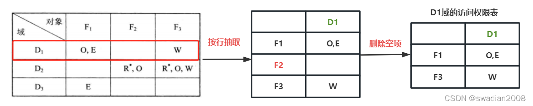 例如,图中在域 D1 中对文件 F3 的写访问权上加有 * 号,表示运行在 D1 域中的进程可以将其对文件 F3 的写访问权扩展到域 D3 中去,类似的,在域 D2 中对文件 F2 的读访问权也是一样。