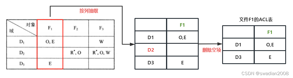 对访问矩阵按列(对象)划分,为每一列建立一张访问控制表 ACL。在该表中已把矩阵中属于该列的所有空项删除,此时的访问控制表是由一有序对(域,权集)所组成的。由于在大多数情况下,矩阵中的空项远多于非空项,因而使用访问控制表可以显著地减少所占用的存储空间,并能提高查找速度。