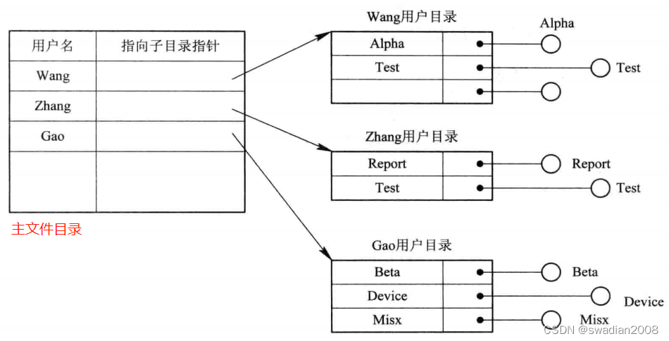 此外,在系统中再建立一个主文件目录 MFD(Master File Directory);在主文件目录中,每个用户目录文件都占有一个目录项,其目录项中包括用户名和指向该用户目录文件的指针。如下图所示,图中的主目录中示出了三个用户名,即 Wang、Zhang 和 Gao。