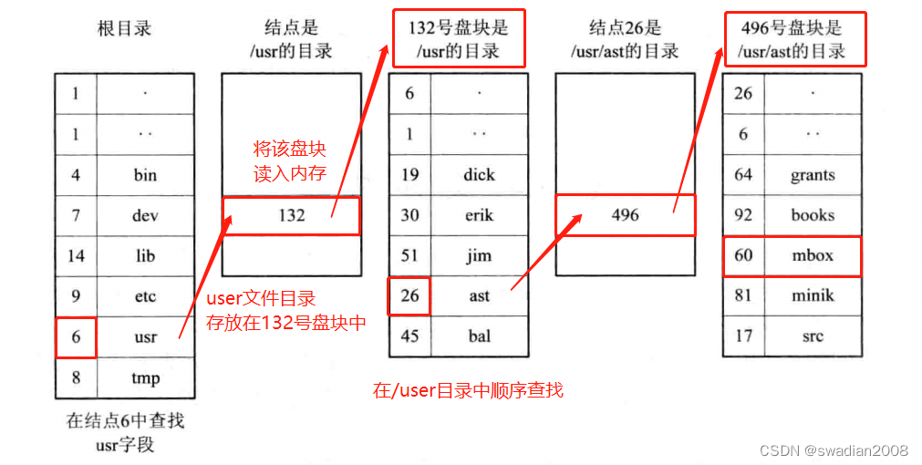 假定用户给定的文件路径名是 /usr/ast/mbox,则查找 /usr/ast/mbox 文件的过程如下图所示。