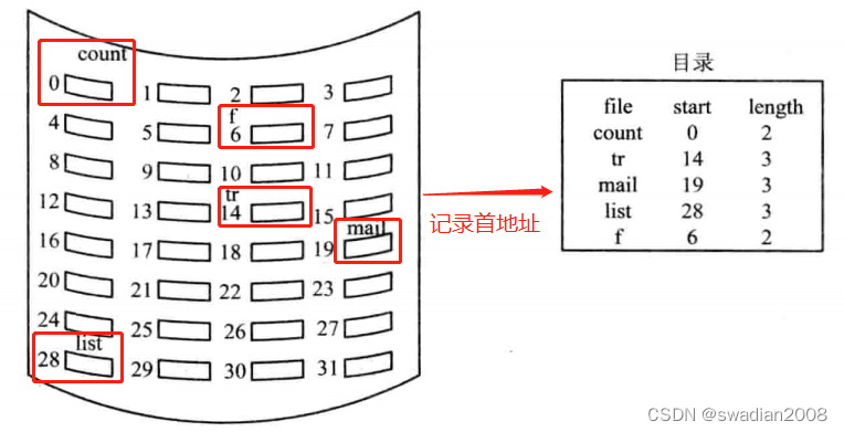 - 连续组织方式:在对文件采取连续组织方式时,为每个文件分配一片连续的磁盘空间,由此所形成的文件物理结构将是顺序式的文件结构。