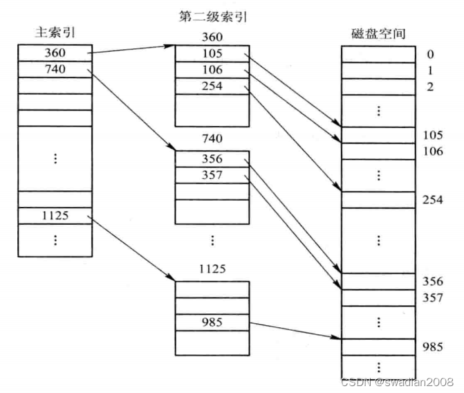 当文件太大,其索引块太多时,应为这些索引块再建立一级索引,称为第一级索引,即系统再分配一个索引块,作为第一级索引的索引块,将第一块、第二块、···.··等索引块的盘块号填入到此索引表中,这样便形成了两级索引分配方式。如果文件非常大时,还可用三级、四级索引分配方式。