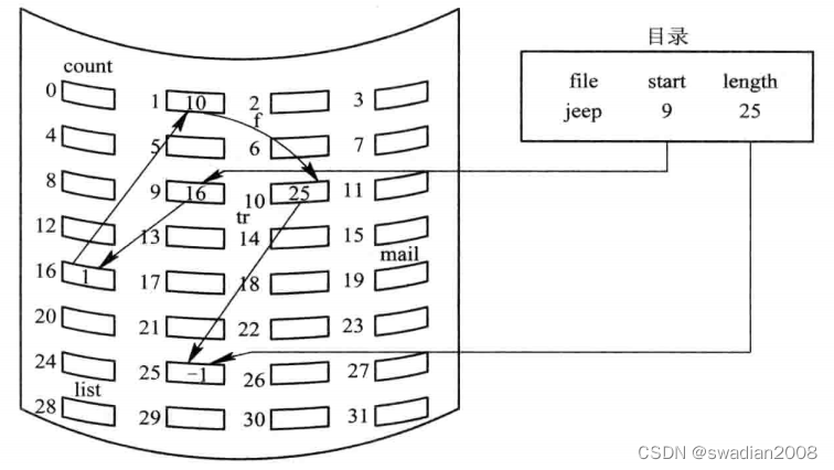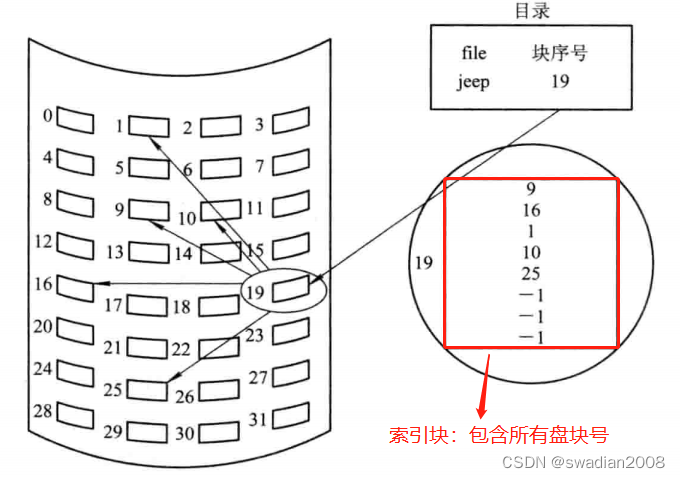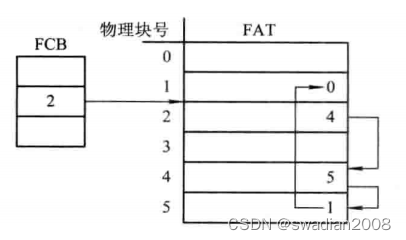 如上图所示,表的序号是物理盘块号,从 0 开始,直至 N - 1(N 为盘块总数)。在每个表项中存放链接指针,即下一个盘块号。