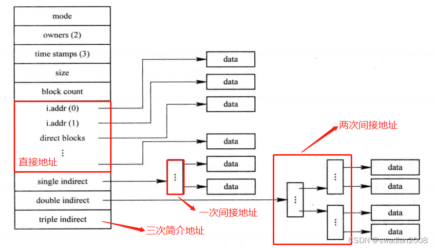 当文件长度太大时,使用一次间址与 10 个直接地址项时地址空间仍不足,系统还需采用二次间址分配方式。这时,用地址项 addr-11 提供二次间接地址(double indirect)。该方式的实质是两级索引分配方式。同理,地址项 addr-12 作为三次间接地址(triple indirect)。