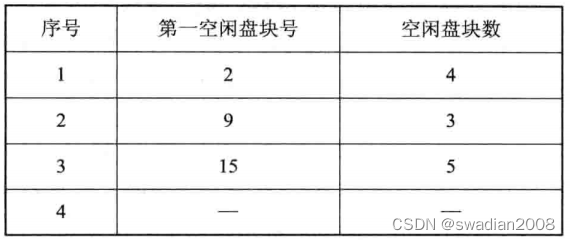 系统为外存上的所有空闲区建立一张空闲表,每个空闲区对应一个空闲表项,表项中包括表项序号、该空闲区的第一个盘块号、该区的空闲盘块数等信息。再将所有空闲区按其起始盘块号递增的次序排列,形成空闲盘块表,如下图所示。