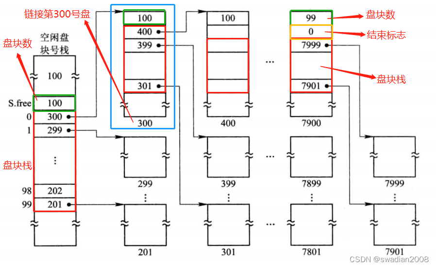 文件区中的所有空闲盘块被分成若干个组,比如,将每 100 个盘块作为一组。假定盘上共有 10000 个盘块,每块大小为 1KB,其中第 201 ~ 7999 号盘块用于存放文件,即作为文件区,这样,该区的最末一组盘块号应为 7901 ~ 7999;次末组为 7801 ~ 7900,倒数第二组的盘块号为 301 ~ 400;第一组为 201 ~ 300,如上图所示。
