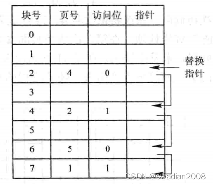 置换算法在选择一页淘汰时,只需检查页的访问位。如果是 0,就选择该页换出;若为 1,则重新将它置 0,暂不换出,给予该页第二次驻留内存的机会,再按照 FIFO 算法检查下一个页面。当检查到队列中的最后一个页面时,若其访问位仍为 1,则再返回到队首去检查第一个页面。