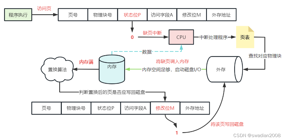 该程序通过查找页表得到该页在外存的物理块后,如果此时内存能容纳新页,则启动磁盘 I/O,将所缺之页调入内存,然后修改页表。如果内存已满,则须先按照某种置换算法,从内存中选出一页准备换出。