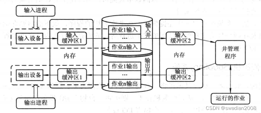 这是在磁盘上开辟出来的两个存储区域。输入井模拟脱机输入时的磁盘,用于收容 I/O 设备输入的数据。输出井模拟脱机输出时的磁盘,用于收容用户程序的输出数据。输入/输出井中的数据一般以文件的形式组织管理,我们把这些文件称为井文件。一个文件仅存放一个进程的输入或输出数据,所有进程的数据输入或输出文件链接成为一个输入或输出队列。