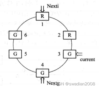 因此,环形缓冲区也包含多个指针。如,用于指示下一个有数据的缓冲区 G 的指针 Nextg,指示下次可用的空缓冲区 R 的指针 Nexti,以及用于指示正在使用的缓冲区 C 的指针 Current。