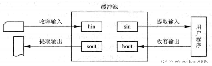 - 提取输出。从输出队列 outq 的队首取得一装满输出数据的缓冲区,作为提取输出工作缓冲区 sout。缓冲区 sout 数据提取完后,将它挂在空缓冲队列末尾。//输出队列->空队列