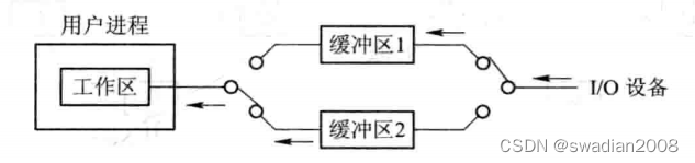 为了加快输入和输出速度,提高设备利用率,又引入了双缓冲区机制,也称为缓冲对换(Buffer Swapping)。在设备输入时,先将数据送入第一缓冲区,装满后便转向第二缓冲区。