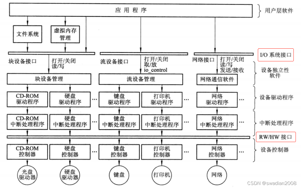I/O 软件涉及的面很宽,向下与硬件有密切关系,向上又与文件系统、虚拟存储器系统和用户直接交互,它们都需要 I/O 系统来实现 I/O 操作。为使十分复杂的 I/O 软件能具有清晰的结构、更好的可移植性和易适应性,目前已普遍采用层次式结构的 I/O 系统。这是将系统中的设备管理模块分为若干个层次,每一层都是利用其下层提供的服务,完成输入输出功能中的某些子功能,并屏蔽这些功能实现的细节,向高层提供服务。
